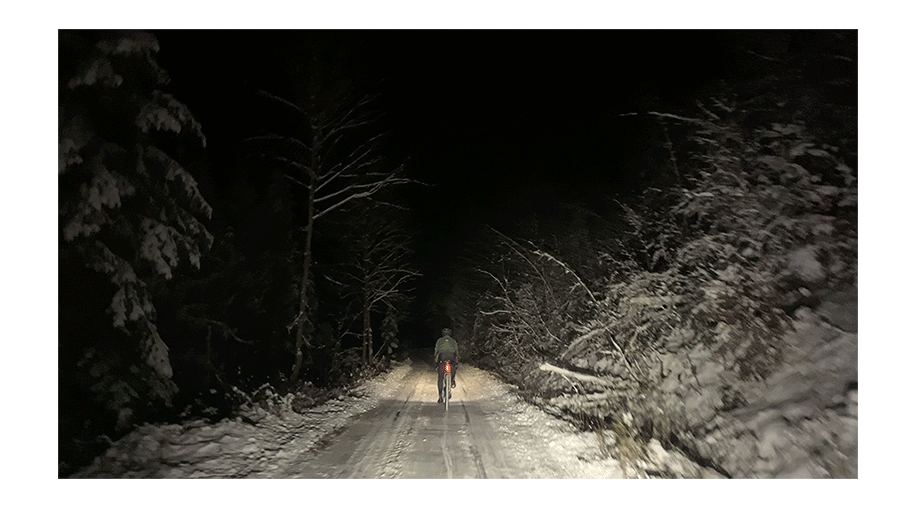 Once we reach the top, I am surprised by a cross-country ski track, not a good sign. Our egos won't allow us to turn back, so we continue. Luckily the road is somehow clear from a vehicle with big and wide tires. Road is rideable! Another win. It's actually quite fun to pedal along, which takes our minds and attention away from the fact that it's -8°C. I might call this one a bitter win.