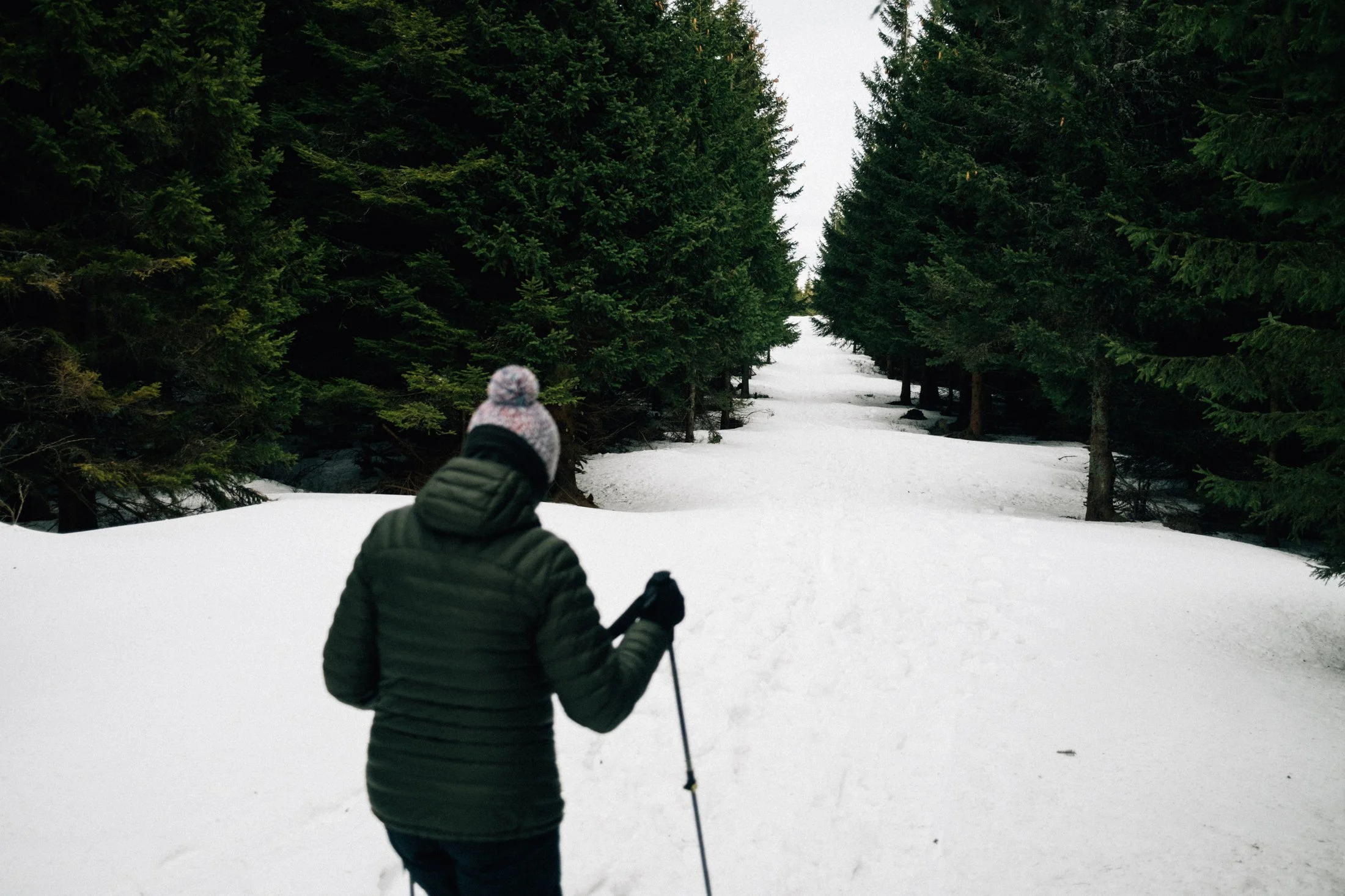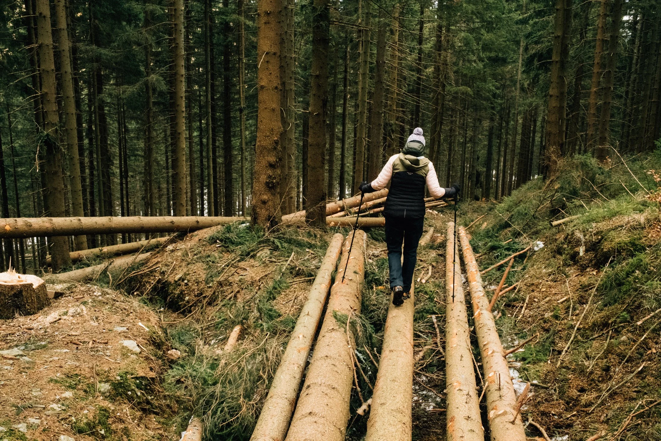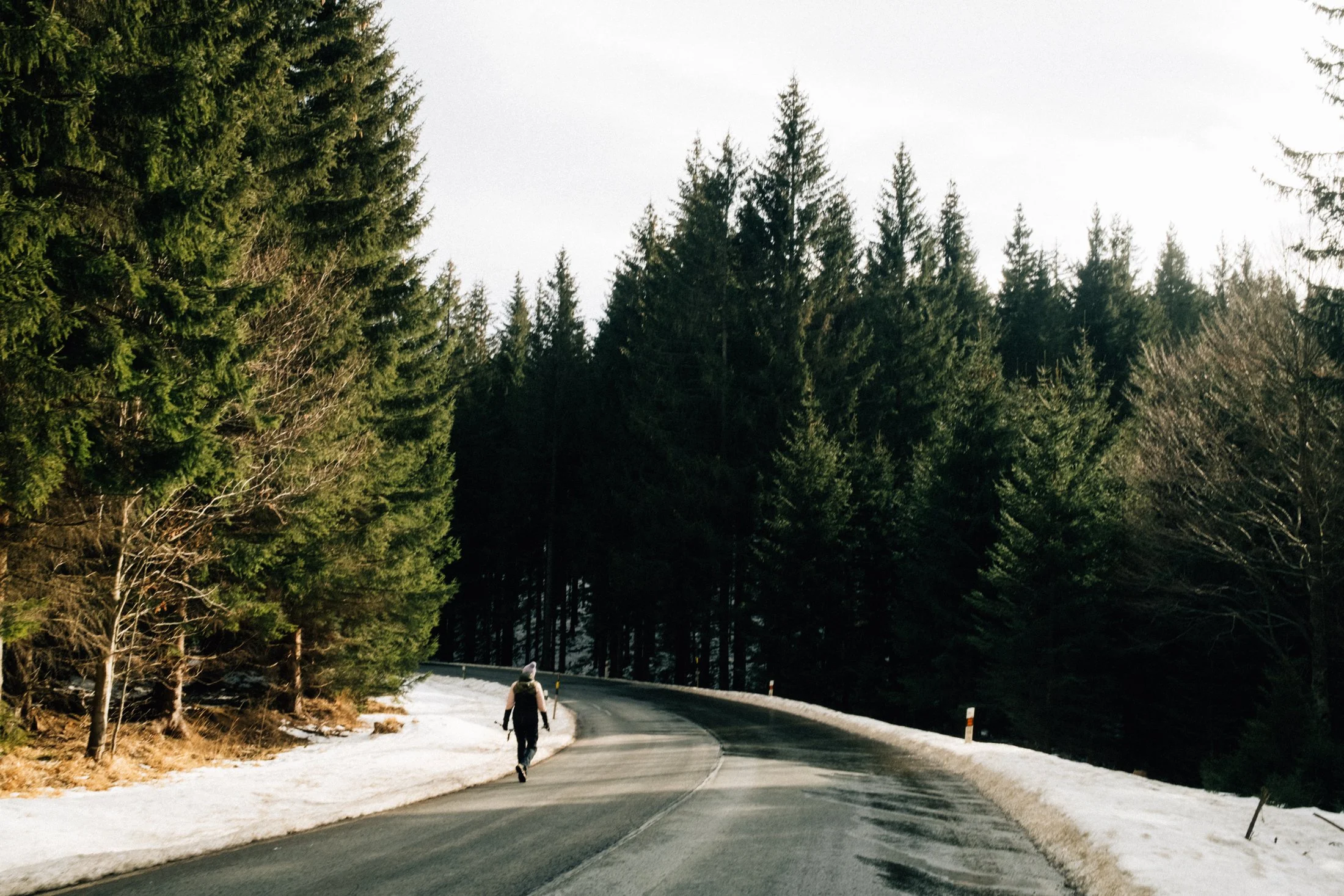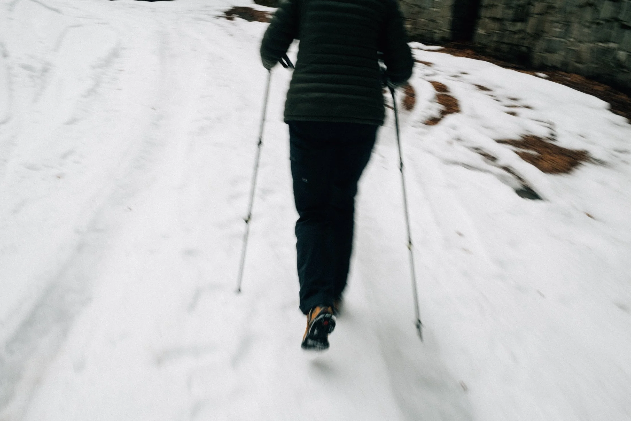 Eventually, the wind picks up, as if nudging us to head out. Nature has its way of telling you when it’s time to go. So, we pack up and start walking. From here, it’s all downhill—easy stuff. There’s barely any snow in the forest now, so the trail’s pretty smooth.