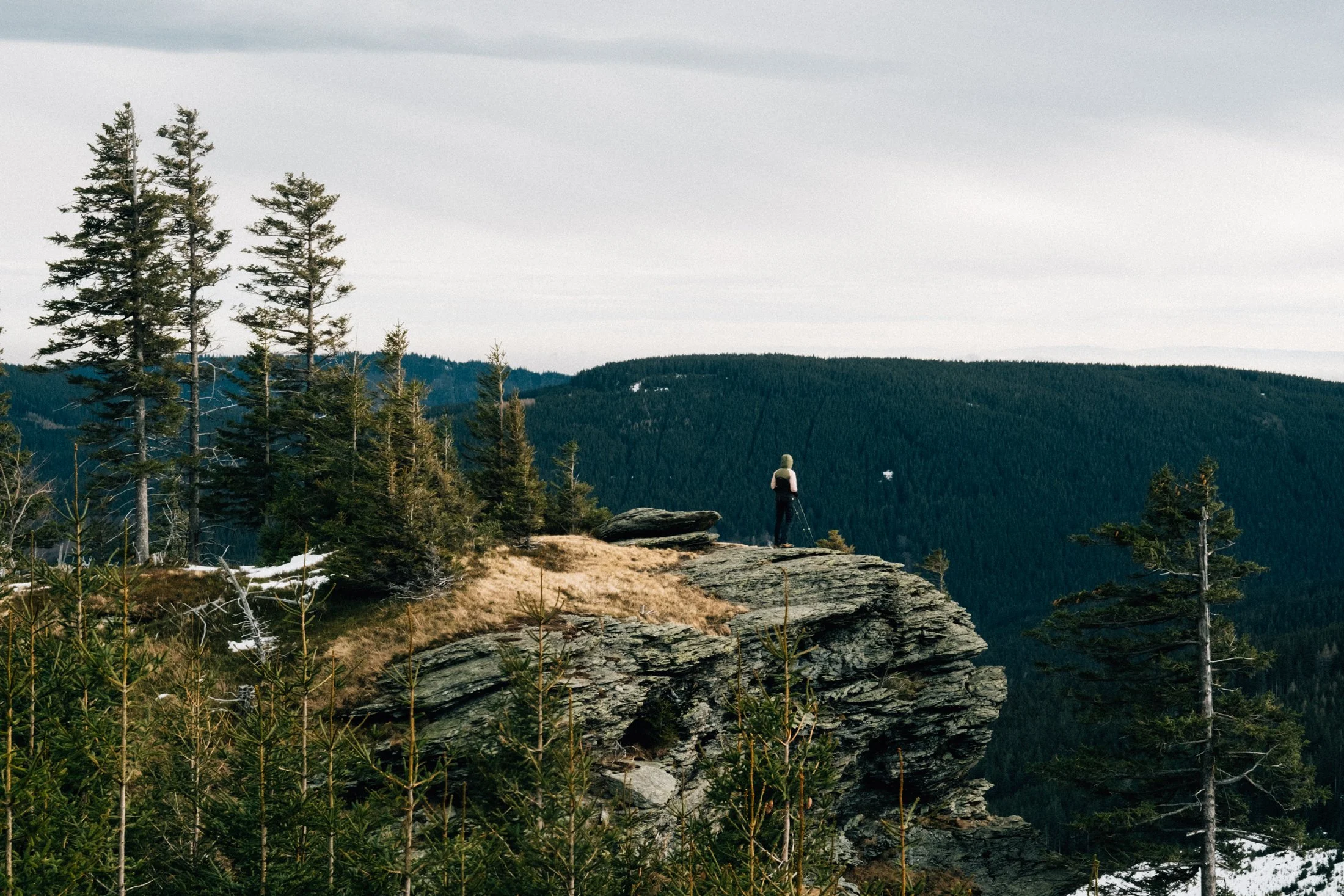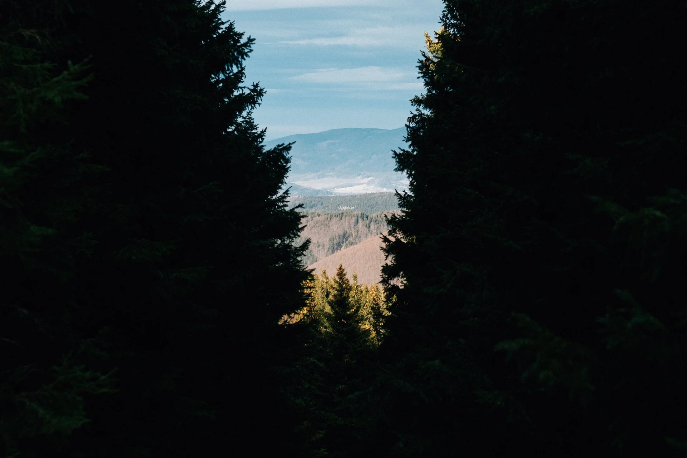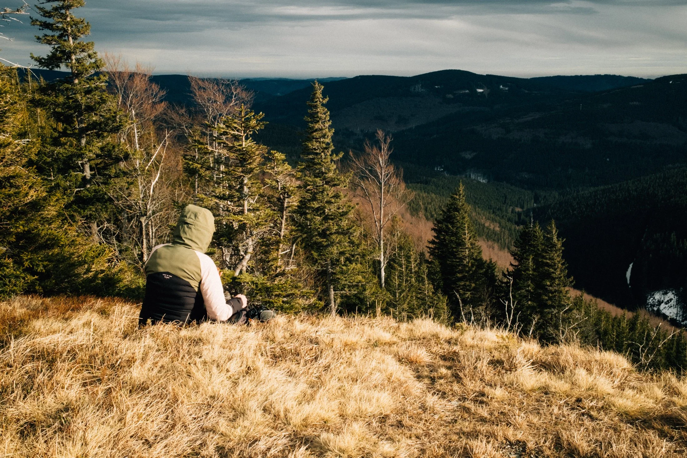 As soon as we roll into Vrbno, the fog lifts like magic. Now the sky’s got scattered clouds, patches of blue, and maybe even some sunshine. You can spot the hilltops and the outlines of the forests. Our mood instantly picks up. We park the car, lace up our boots, gear up, and I sling my camera around my neck. Time to hit the trail.