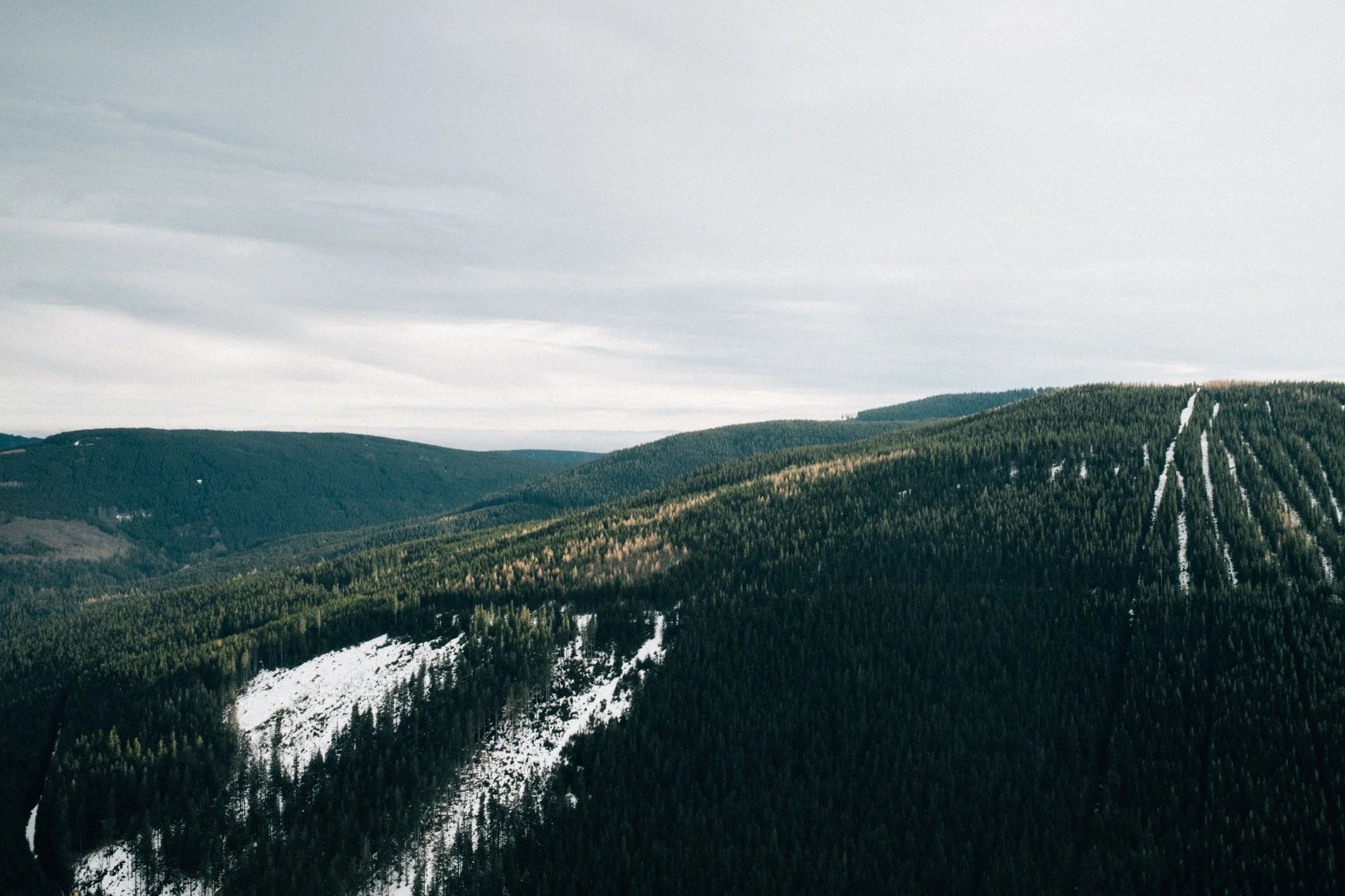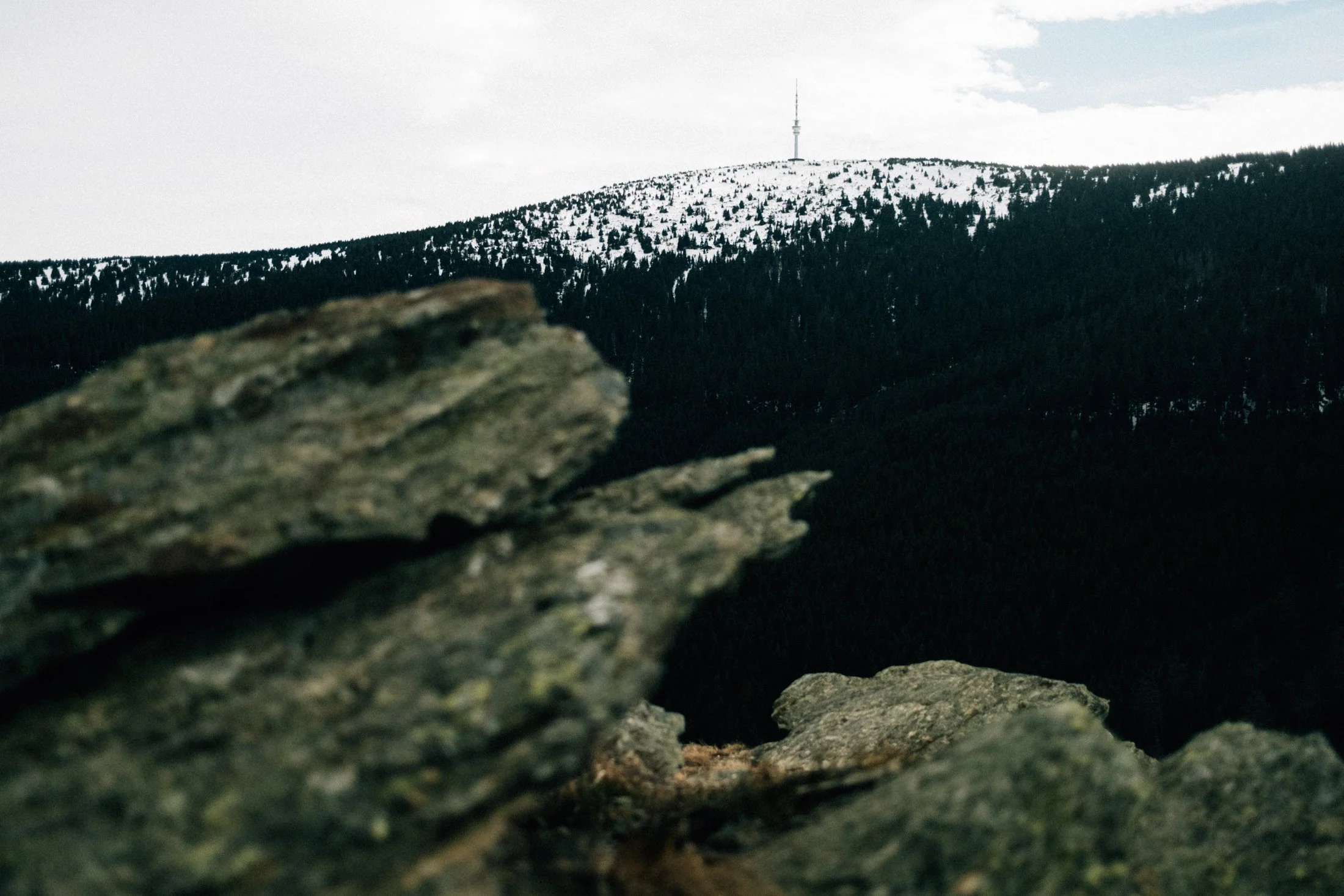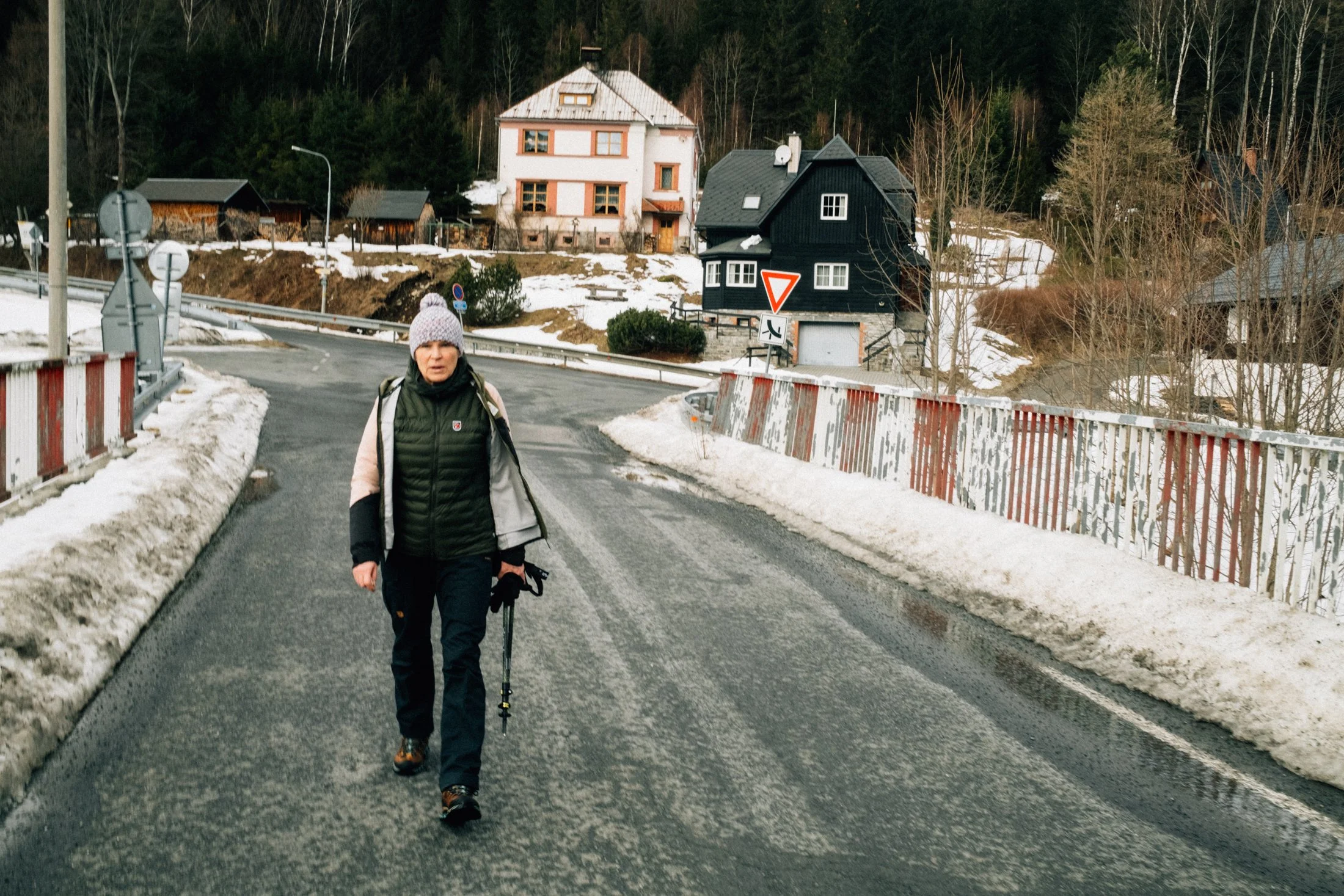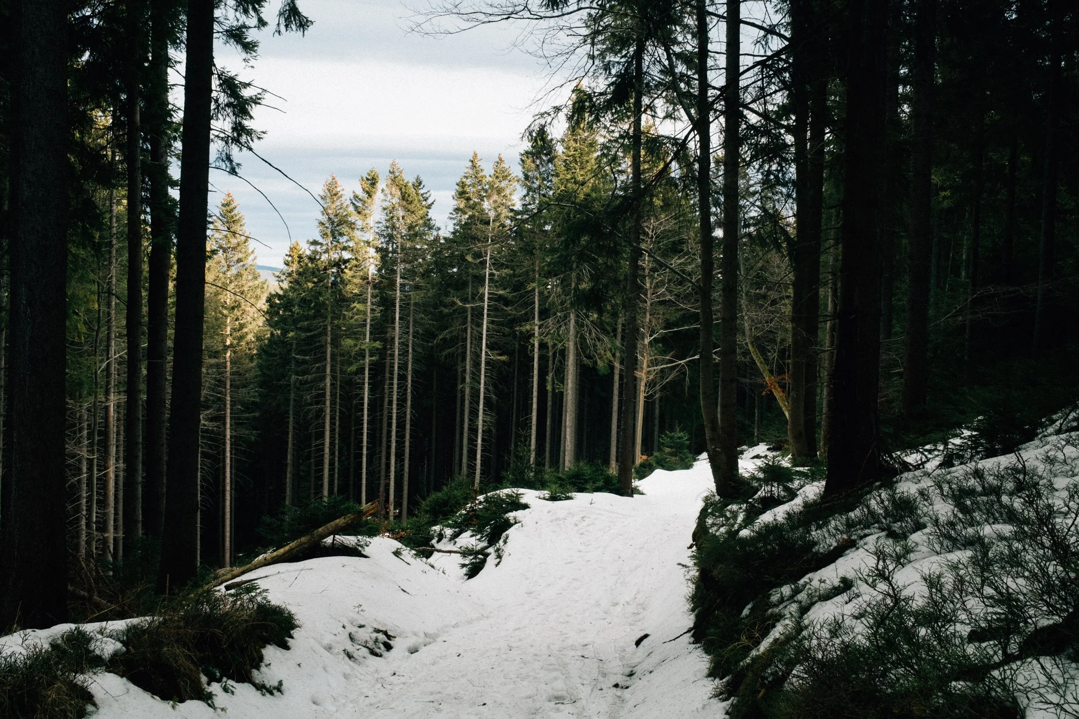 As soon as we roll into Vrbno, the fog lifts like magic. Now the sky’s got scattered clouds, patches of blue, and maybe even some sunshine. You can spot the hilltops and the outlines of the forests. Our mood instantly picks up. We park the car, lace up our boots, gear up, and I sling my camera around my neck. Time to hit the trail.