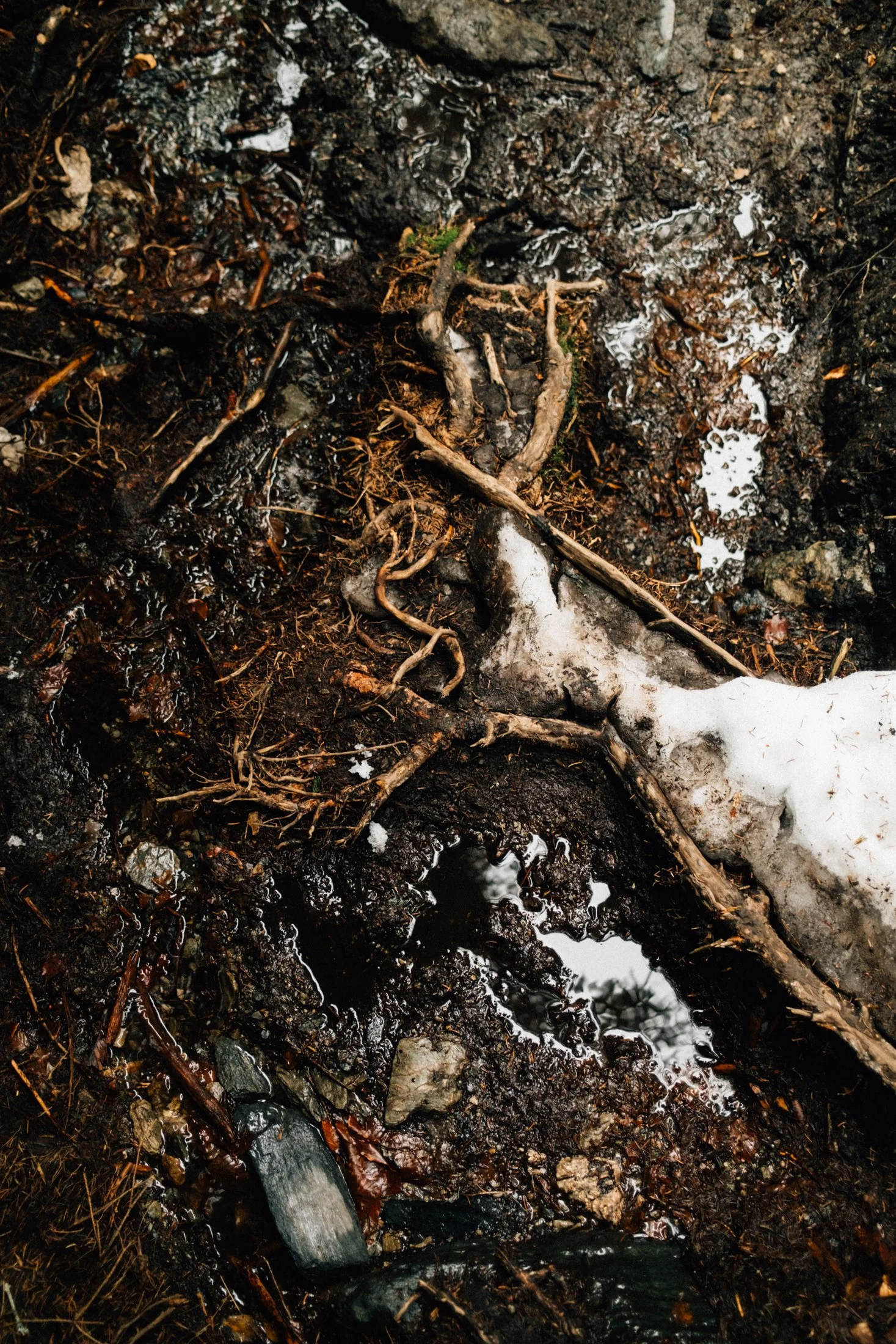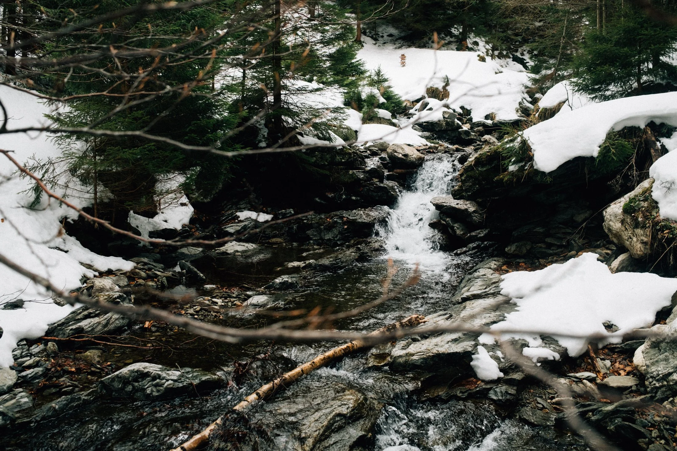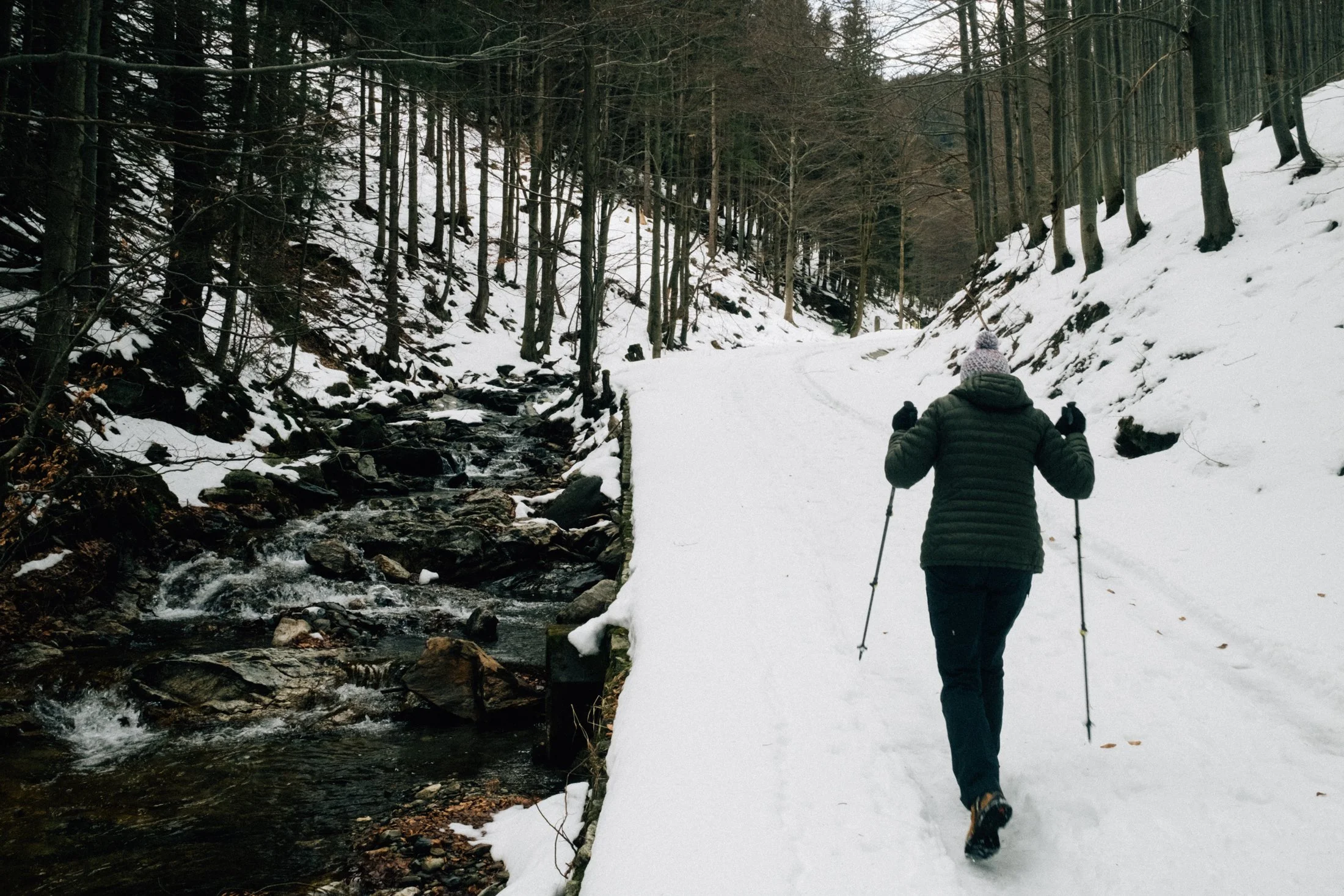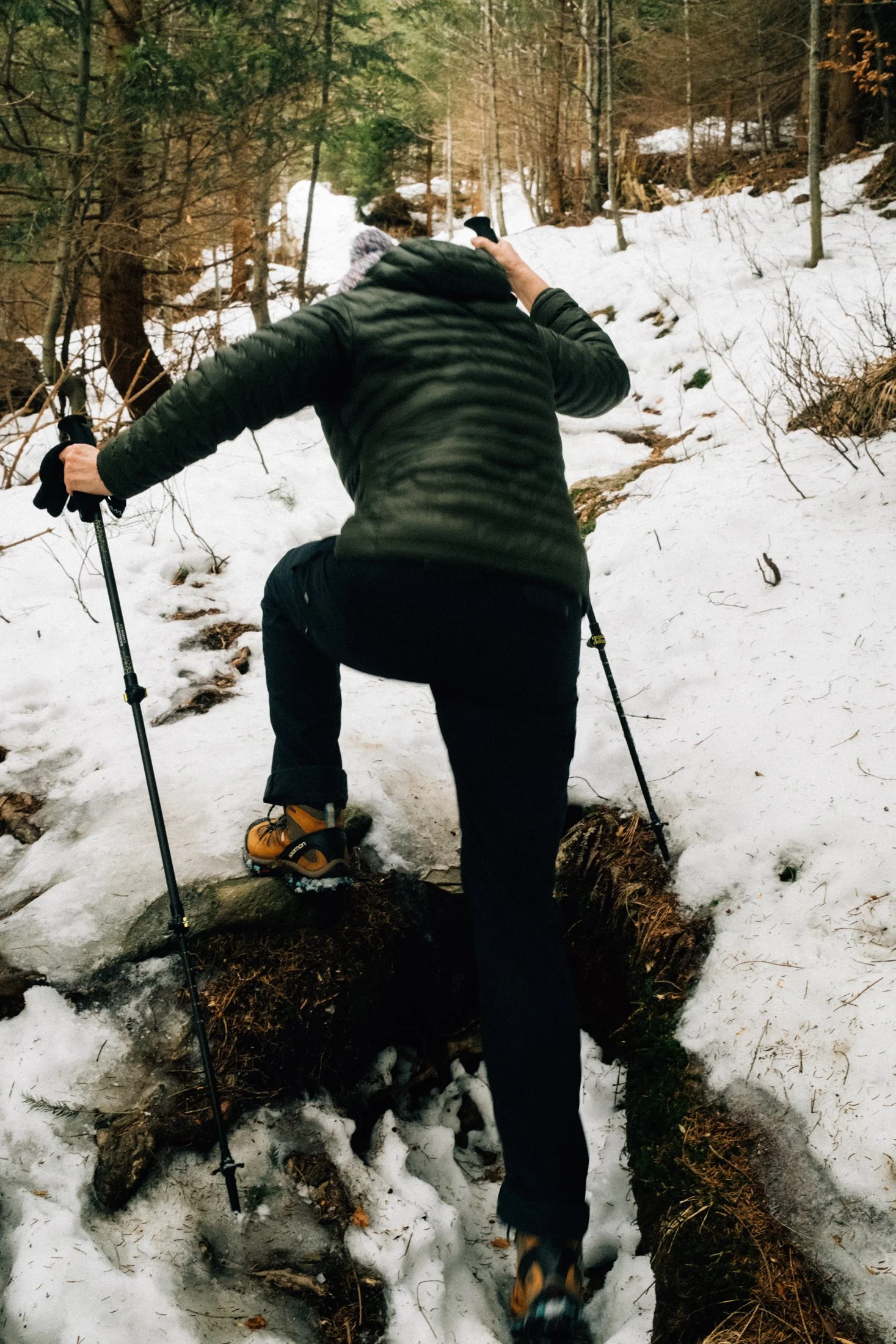 The stream hums nearby, and the melting snow adds a peaceful vibe (though I kind of wish the snow would stick around). The only tough part—especially for my mom—is these massive steps eroded by water. Add a layer of snow, and it gets a bit sketchy.