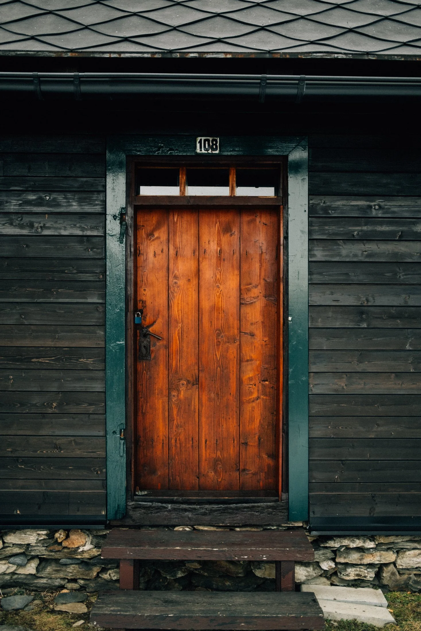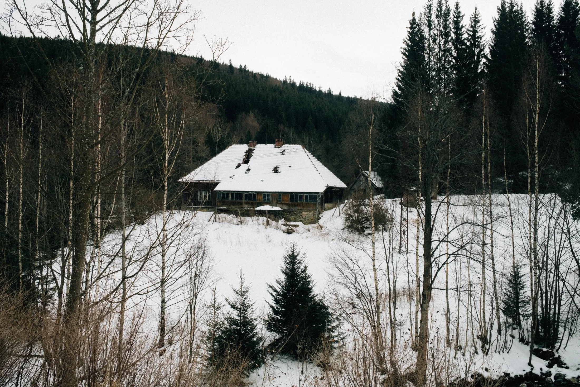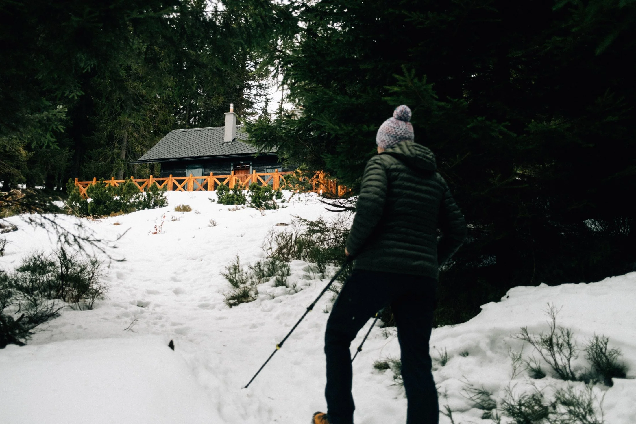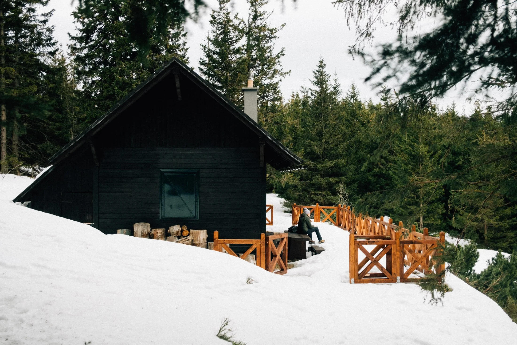 Still, we manage just fine, and soon enough, we spot a clearing in the forest with a gorgeous hunting cabin. Whoever built this place nailed the location—it’s absolutely stunning. If I could, I’d move in right now. But for now, we settle for having a snack here.