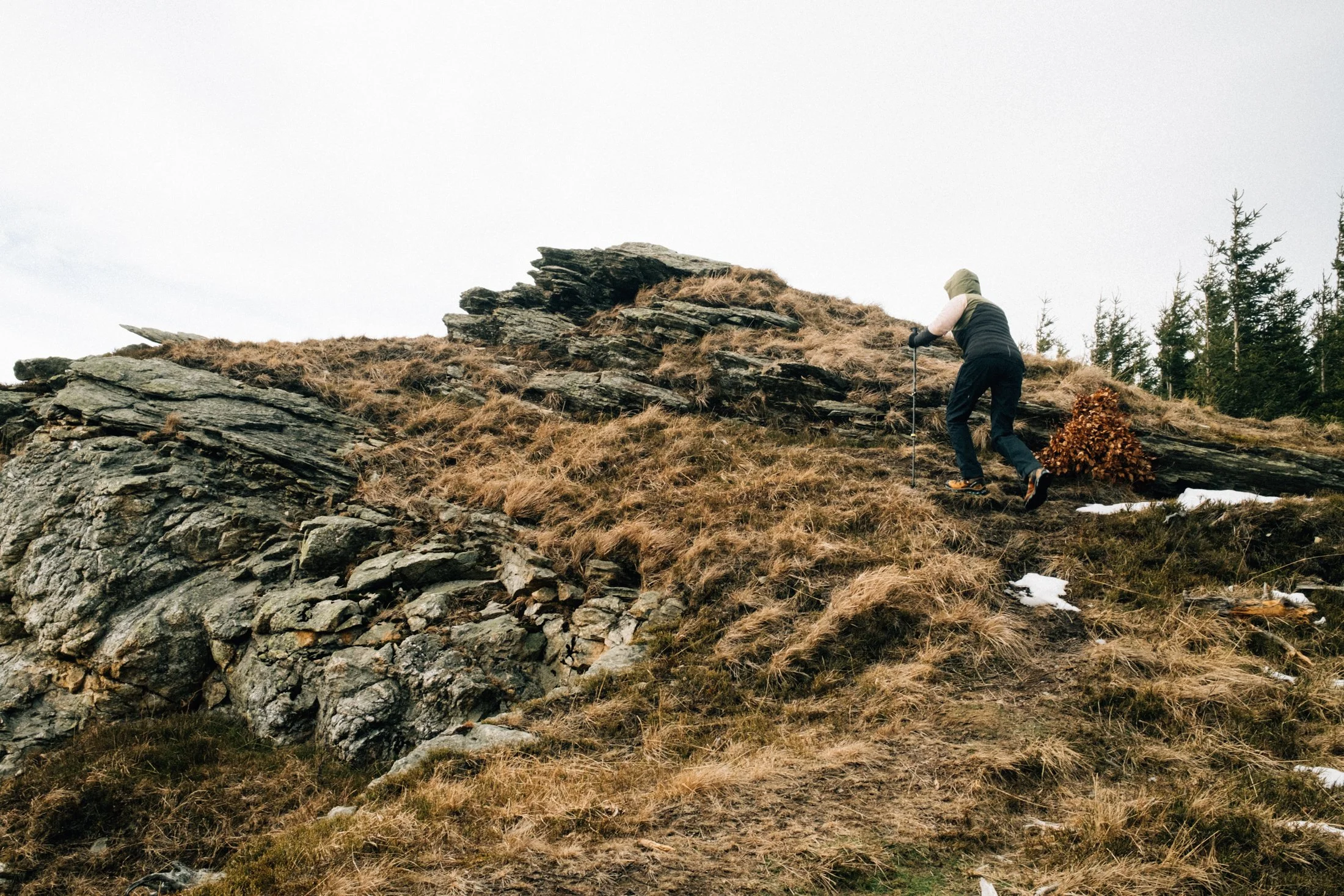 After a short walk, we come across some rocks, and wow—it’s just beautiful. Right then, the sun comes out, almost as if it’s welcoming us. These rocks are tucked away between young trees, only visible from the opposite, harder-to-reach hills. Not many people venture here, especially in winter. It’s all ours.