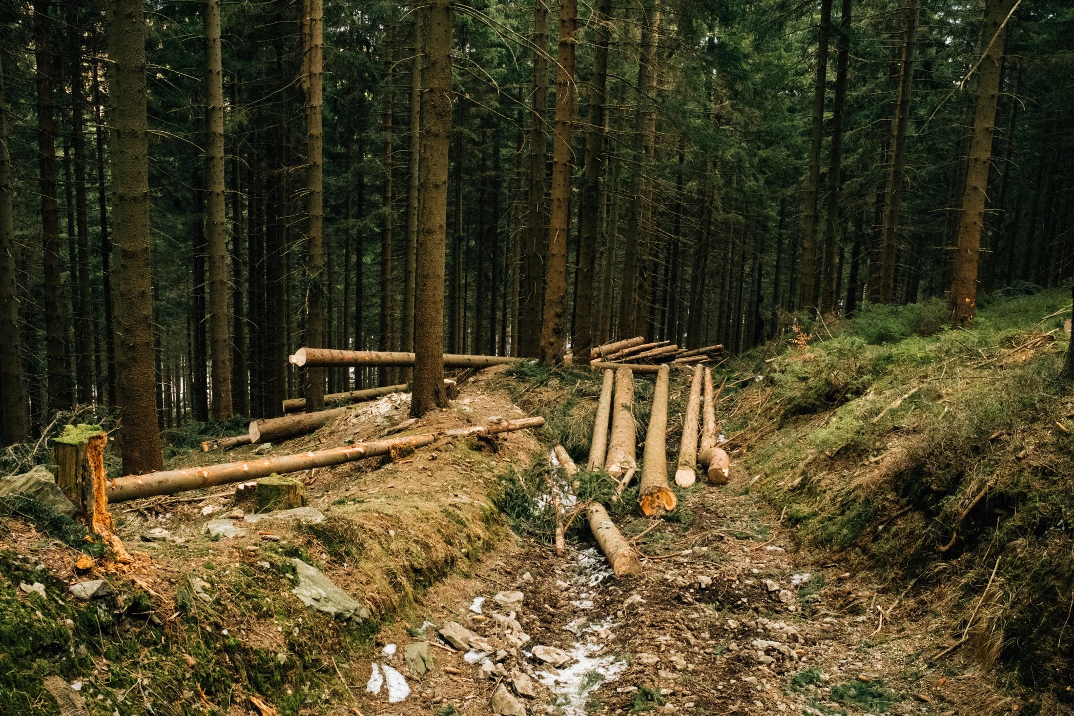 We stick to the marked tourist trail until the asphalt road ends. From there, it turns into a forest path—more of a trail, really—that winds uphill alongside a stream. Walking on the asphalt isn’t great; it’s full of deep tire ruts, super slippery, and honestly, just a pain. But once we hit the trail, everything changes.